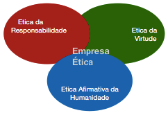 Ainda no que diz respeito ao tema da sustentabilidade, podemos nos desviar um pouco do centro e tratar das empresas éticas, e da forma como elas se comportam. R. Patrus, em seu trabalho “Modelo de Empresa Ética” afirma que estas, diferentemente das “anti-éticas” e das empresas “maquiadas”, têm marco ético referencial que contempla igualmente a ética da responsabilidade , mais voltada aos resultados, fins…. a Ética afirmativa da humanidade e a Ética da Virtude, que compreende melhor o papel da coletividade, e é engajada em propósitos mais nobres e sustentáveis( ver figura 3).