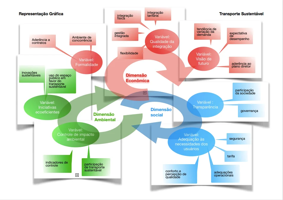 A mobilidade urbana sustentável depende do equilíbrio das dimensões econômica, social e ambiental, que se apresentam sob a forma de variáveis que por sua vez são explicadas a partir dos atributos que as compõem. Os projetos de SmartCities – cidades inteligentes impactam, de alguma forma, todas as variáveis e atributos da mobilidade urbana sustentável mas para aprofundarmo-nos no assunto, concentramos nosso foco nas variáveis “adequação às necessidades dos usuários” e “transparência” da dimensão social, “visão de futuro” da dimensão econômica e “iniciativas ecoeficientes” no seu atributo “inovações sustentáveis” da dimensão ambiental.